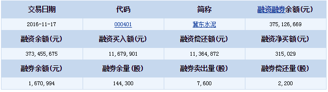 冀東水泥(000401)2016-11-17融資融券信息顯示,冀東水泥融資余額373,455,675元,融券余額1,670,994元,融資買入額11,679,901元,融資償還額11,364,872元,融資凈買額315,029元,融券余量144,300股,融券賣出量7,600股,融券償還量2,200股,融資融券余額375,126,669元。冀東水泥融資融券詳細信息如下表: