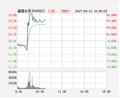 今日福建水泥(13.31 +7.25%,買入)開盤報12.31元,截止10:05分,該股漲9.99%報13.65元,封上漲停板。