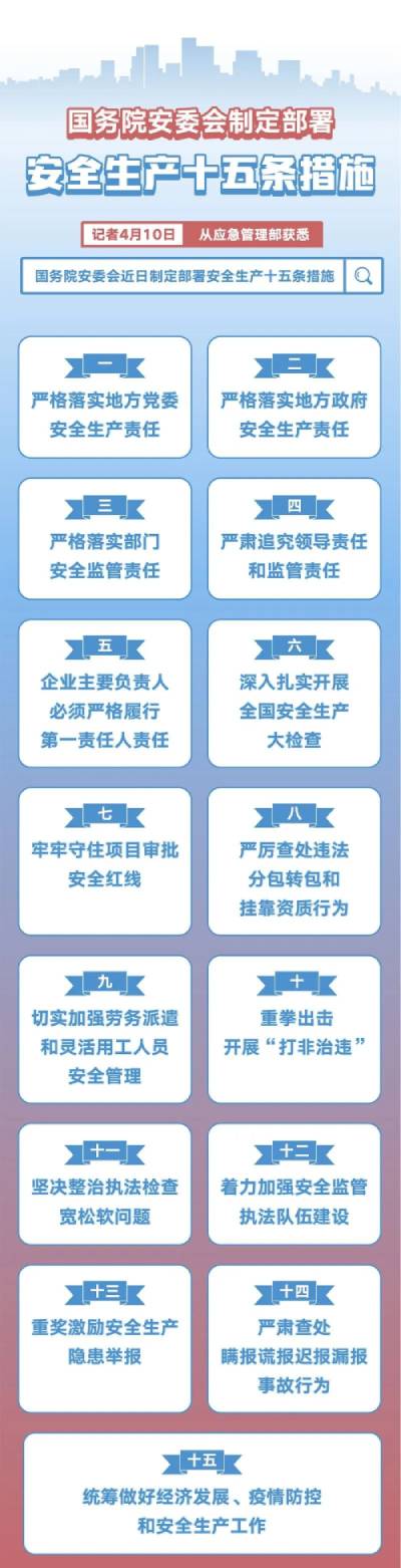 國務(wù)院安委辦有關(guān)負(fù)責(zé)人介紹,國務(wù)院安委會梳理相關(guān)法律法規(guī)已有規(guī)定、以往管用舉措和近年來針對新情況采取的有效措施,制定了進(jìn)一步強(qiáng)化安全生產(chǎn)責(zé)任落實、堅決防范遏制重特大事故的十五條措施,部署發(fā)動各方面力量全力抓好安全防范工作。