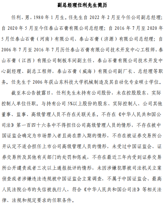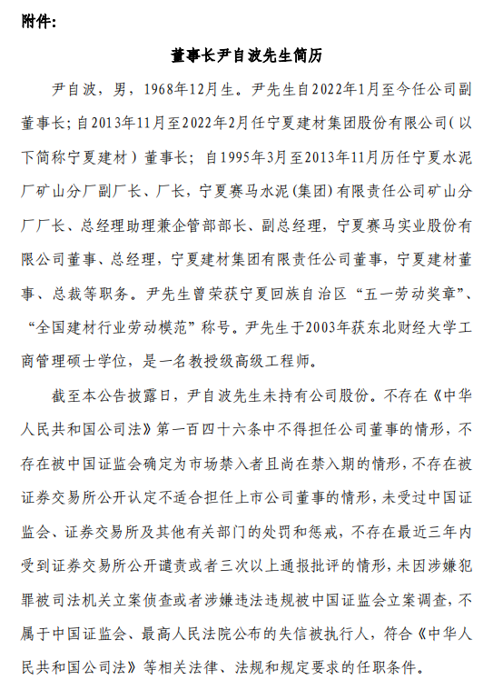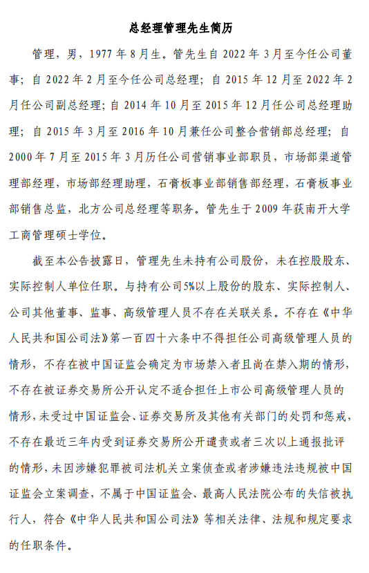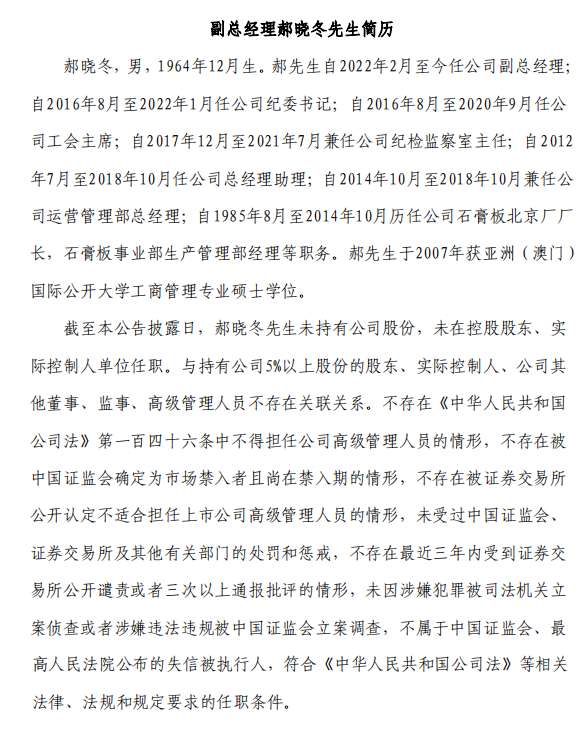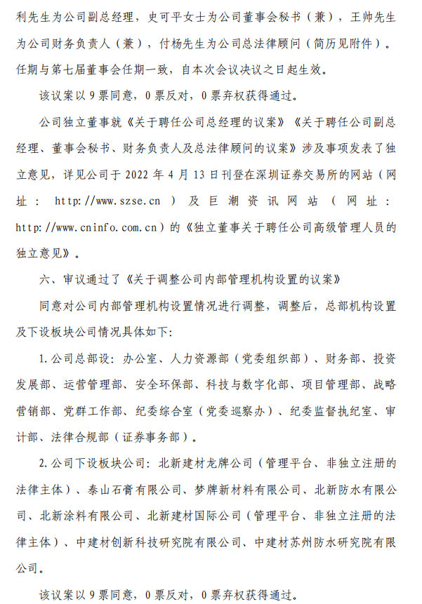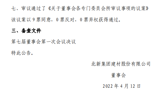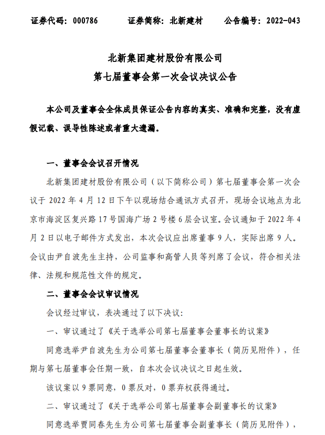 4月12日,北新建材發(fā)布第七屆董事會第一次會議決議公告稱,此次會議審議通過了《關(guān)于選舉公司第七屆董事會董事長的議案》,同意選舉尹自波先生為公司第七屆董事會董事長,任期與第七屆董事會任期一致,自本次會議決議之日起生效。