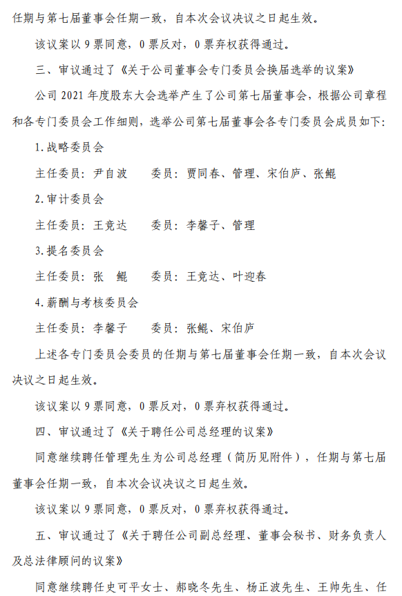 繼續(xù)聘任管理先生為公司總經(jīng)理,任期與第七屆董事會任期一致,自本次會議決議之日起生效。