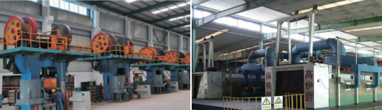 國鎂耐火擁有1700°C-1850℃超高溫隧道窯2條,鎂質不定型耐火材料生產線1條,原料生產線2條,礦山1座,鎂碳磚生產線1條。充足的料倉及成熟的自動配料系統保證高精度配料;德國EIRICH高效強力混砂機,提高混料效能;世界先進的液壓機壓制磚坯,坯體均勻,尺寸精確。