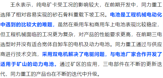 同力重工TL105E純電動非公路寬體自卸車榮獲工程機械行業(yè)“新能源金獎”產品稱號,這是用戶與行業(yè)對同力重工的高度肯定,也是對同力重工的強大激勵。在頒獎典禮上,同力重工副總經理楊建耀發(fā)表了熱情洋溢的獲獎感言,他表示:同力重工將珍惜這份榮譽持續(xù)加大研發(fā)投入,為廣大用戶提供技術成熟、性能先進、性價比更高的產品與服務,持續(xù)引領行業(yè)技術創(chuàng)新,為碳達峰、碳中和目標實現(xiàn)貢獻同力智慧與方案,體現(xiàn)同力重工的責任與擔當,與行業(yè)同仁一起探尋工程機械電動化新的未來!