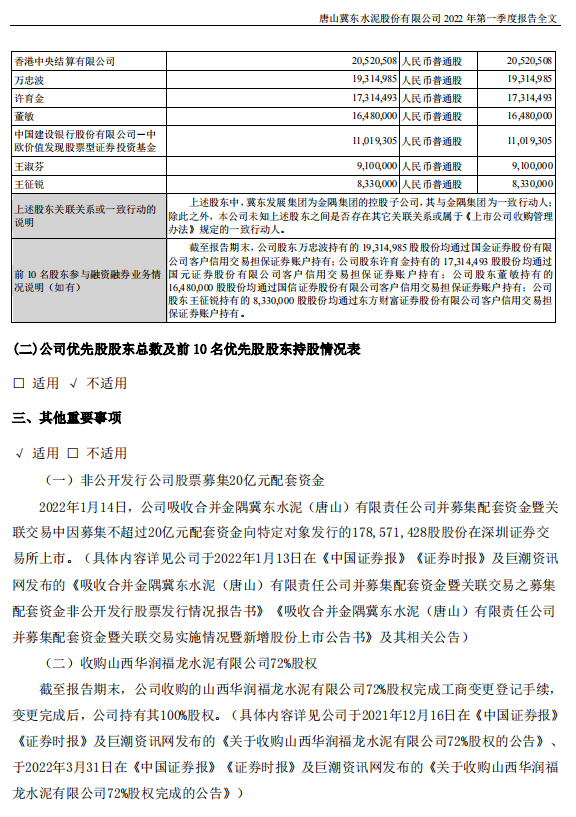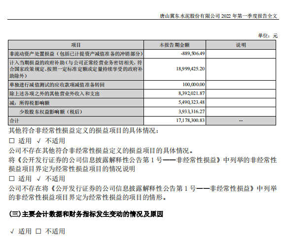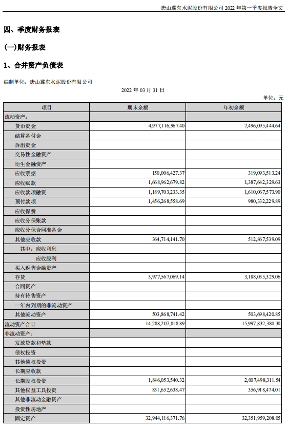 冀東水泥于2022年4月20日披露一季報,公司2022年一季度實現營業總收入49.7億,同比下降2.5%;實現歸母凈利潤-2.3億,上年同期為-5148.6萬元,虧損幅度擴大。