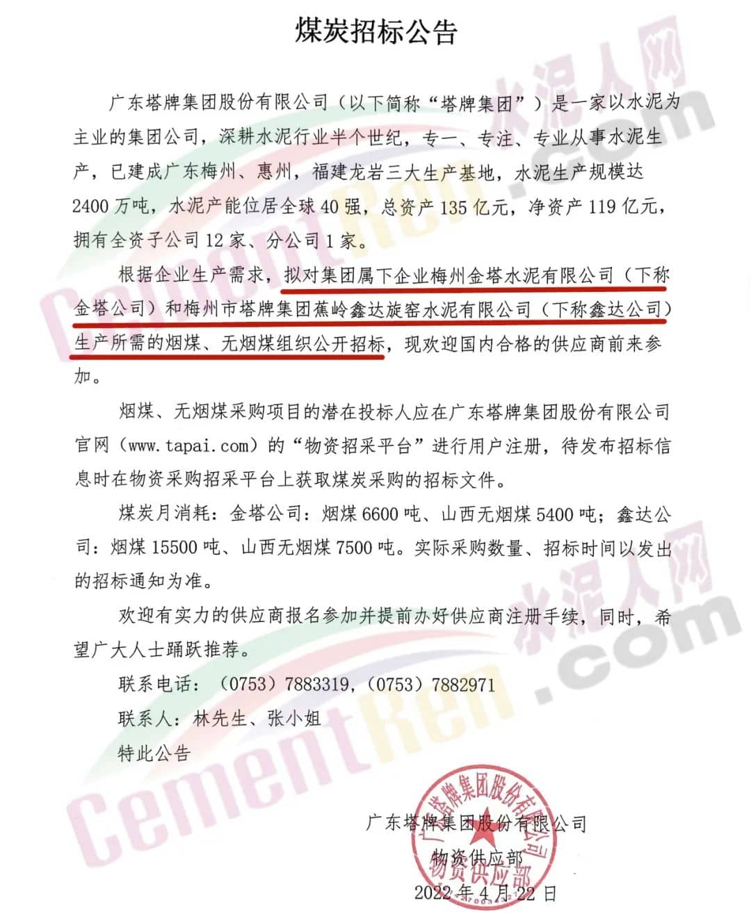 塔牌集團煤炭采購通知!