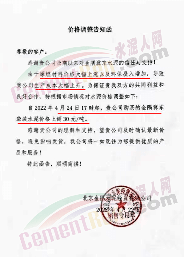 日前,北京金隅水泥經貿公司通知,由于原燃材料價格大幅上漲以及環保投入增加,導致公司生產成本大幅上升。根據市場情況自2022年4月24日17時起,金隅冀東袋裝水泥價格上調30元/噸。
