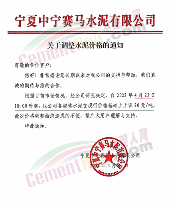 寧夏中寧賽馬水泥有限公司通知,根據目前市場情況,經公司研究決定,自2022年4月23日18時起,公司各規格水泥在現行價格基礎上上調20元/噸。