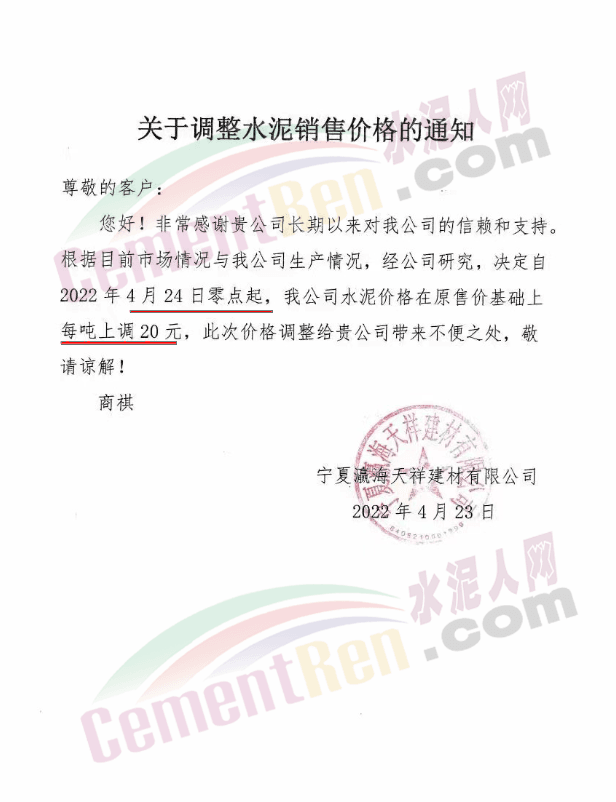 寧夏瀛海天祥建材有限公司通知,根據目前市場情況與公司生產情況,經公司研究,決定自2022年4月24日零點起,公司水泥價格在原售價基礎上上調20元/噸。
