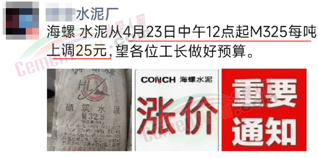 同日,陜西關中地區海螺水泥通知從4月23日中午12點起M325砌筑水泥上調25元/噸。