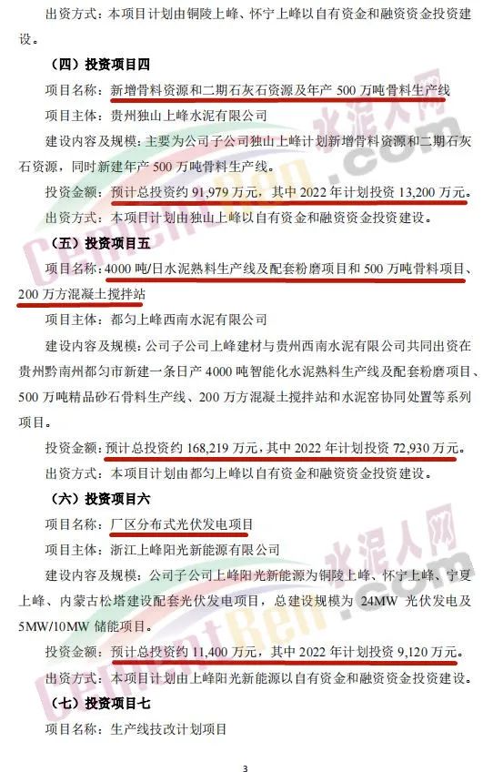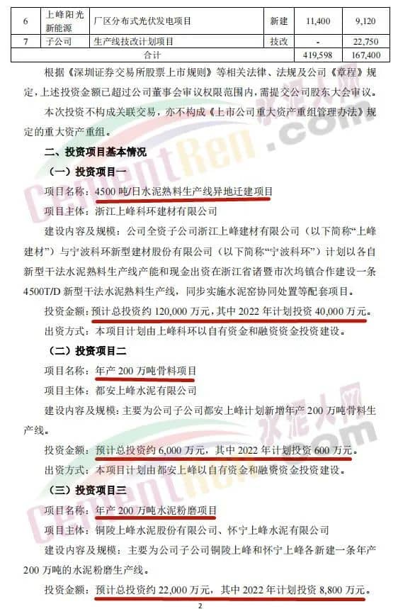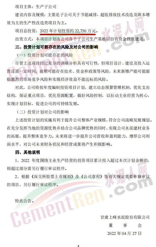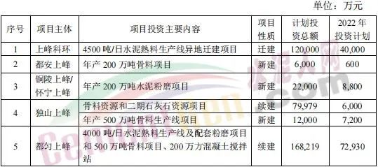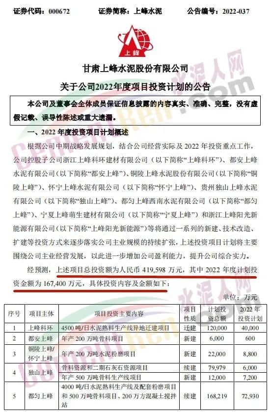 4月27日,甘肅上峰水泥股份有限公司發布《關于公司2022年度項目投資計劃的公告》稱,2022年,其控股子公司浙江上峰科環建材有限公司、都安上峰水泥有限公司、銅陵上峰水泥股份有限公司、懷寧上峰水泥有限公司、貴州獨山上峰水泥有限公司、都勻上峰西南水泥有限公司、寧夏上峰萌生建材有限公司和浙江上峰陽光新能源有限公司等將通過一系列的新建、技術改造、擴建等投資方式來逐步落實公司主業規模的持續擴張。