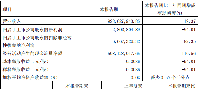 4月26日,甘肅祁連山水泥集團股份有限公司 發(fā)布2022年第一季度業(yè)績報告稱,公司第一季度實現(xiàn)營業(yè)收入928,627,943.85元,同比增長19.37%;歸屬于上市公司股東的凈利潤2,803,804.89元,同比下降94.01%。