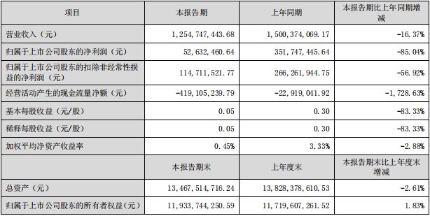 4月21日,廣東塔牌集團股份有限公司發(fā)布2022年第一季度業(yè)績報告稱,公司第一季度實現(xiàn)營業(yè)收入1,254,747,443.68 元,同比下降16.37%;歸屬于上市公司股東的凈利潤52,632,460.64元,同比下降85.04%。
