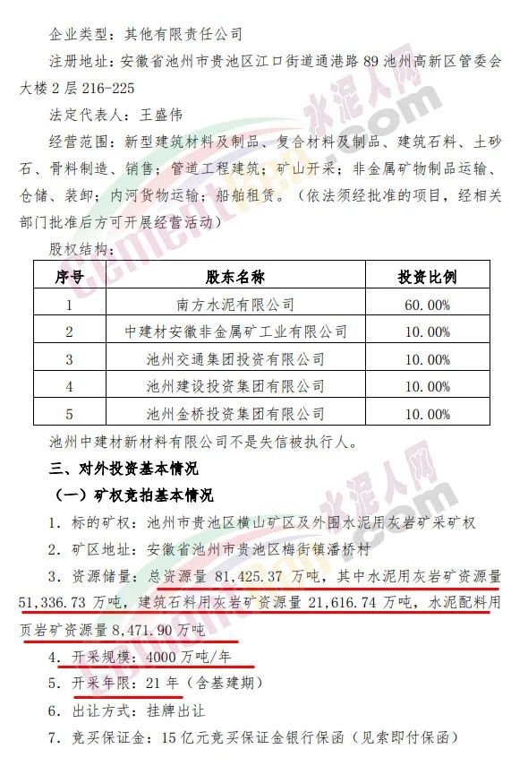 公告顯示,此次標的礦權總資源量約8.14億噸,其中水泥用灰巖礦資源量5.13億噸、建筑石料用灰巖礦資源量2.16億噸、水泥配料用頁巖礦資源量8471.90萬噸,開采規模為4000萬噸/年,開采年限為21年。