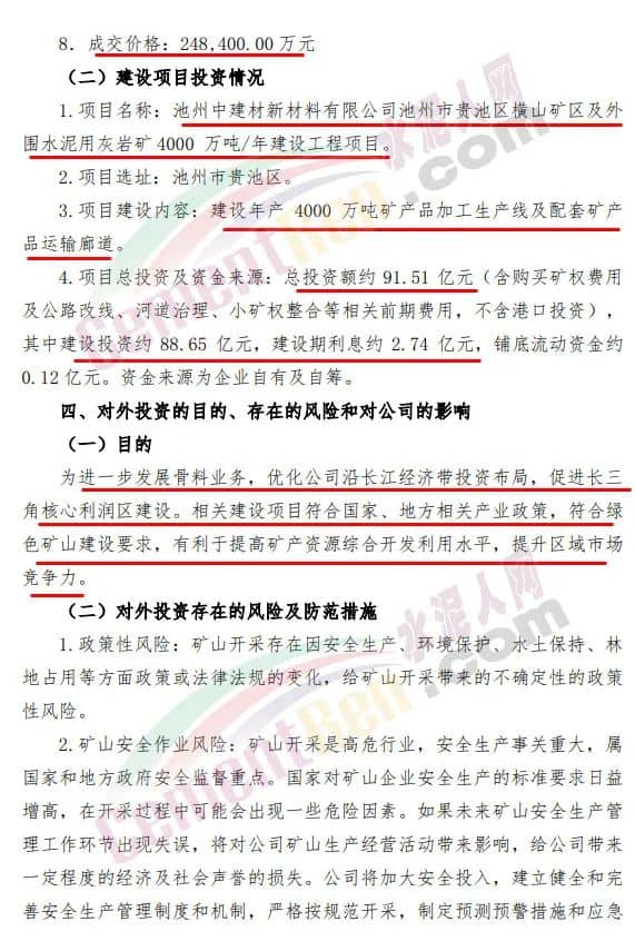 4月27日晚,天山股份公告,控股子公司池州新材料公司以24.84億元競得池州市貴池區橫山礦區及外圍水泥用灰巖礦采礦權。待《采礦權出讓合同》簽訂后,池州新材料公司將建設“池州市貴池區橫山礦區及外圍水泥用灰巖礦4000萬噸/年建設工程項目”,投資總額約91.51億元,此次投資將增加公司骨料產能。