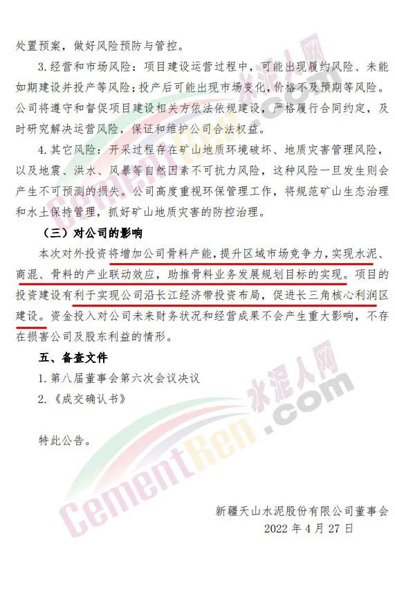 “進一步發展骨料業務,優化公司沿長江經濟帶投資布局,促進長三角核心區建設。”天山股份如此表示。公告全文如下: