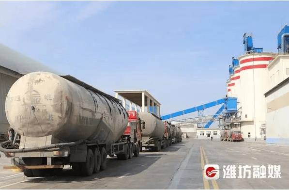 昌樂山水水泥有限公司院內(nèi)等待運輸水泥的車輛。