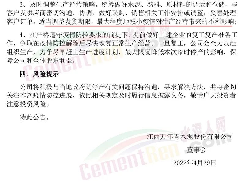 本次臨時停產為萬年縣防疫工作的短期措施,不會對公司的長期發展帶來不利影響。公司將積極配合當地政府做好疫情防控工作,在滿足疫情防控要求的情況下,努力爭取早日復工復產,最大限度降低對公司的影響。