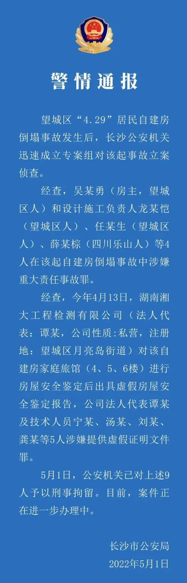 經(jīng)查,吳某勇(房主,望城區(qū)人)和設(shè)計(jì)施工負(fù)責(zé)人龍某愷(望城區(qū)人)、任某生(望城區(qū)人)、薛某棕(四川樂(lè)山人)等4人在該起自建房倒塌事故中涉嫌重大責(zé)任事故罪。