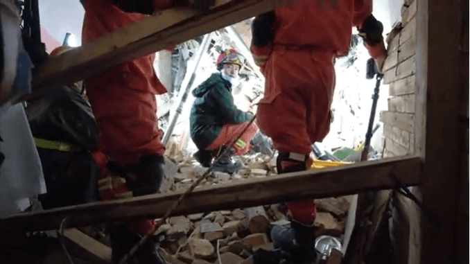 救援現(xiàn)場(chǎng),消防救援人員與時(shí)間賽跑,搶抓72小時(shí)黃金救援時(shí)段,連夜搜救被困人員。