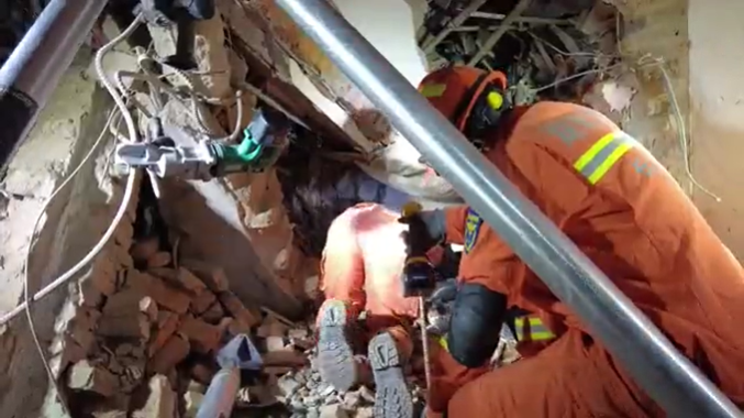 記者現(xiàn)場(chǎng)直擊,液壓頂桿保障現(xiàn)場(chǎng)安全。為保障被困人員安全,救援人員使用很多長(zhǎng)度不一的,液壓頂桿進(jìn)行加固。現(xiàn)場(chǎng)救援時(shí),先用電鉆去鉆,鉆通一點(diǎn)點(diǎn)后,就用手一塊一塊從里面摳出來(lái)。摳完后,每十公分左右的距離,就要用同等大小的,木樁或液壓頂桿,去形成一個(gè)支撐架,確保救援通道的暢通,保證救援人員和被困人員安全。