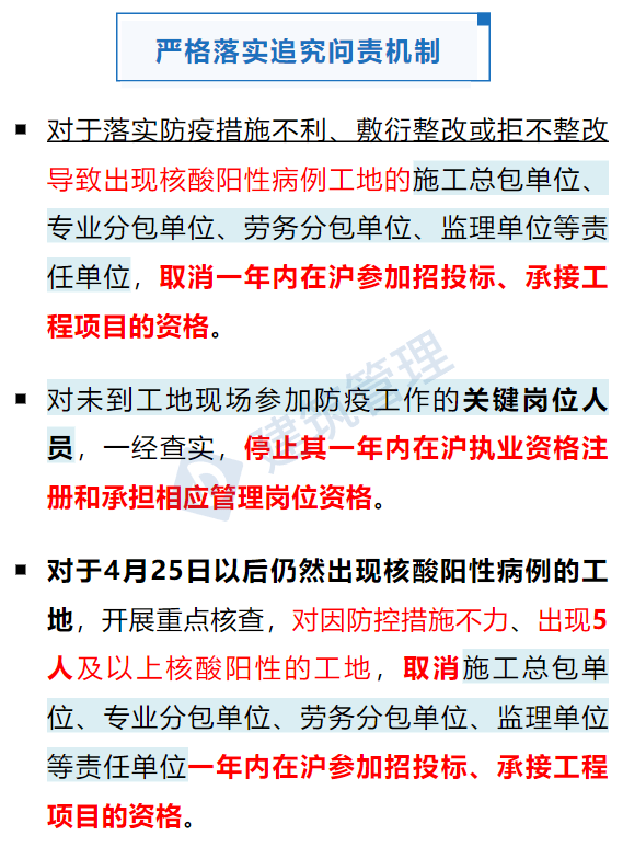 對于落實防疫措施不利、敷衍整改或拒不整改導(dǎo)致出現(xiàn)核酸陽性病例工地的施工總包單位、專業(yè)分包單位、勞務(wù)分包單位、監(jiān)理單位等責(zé)任單位,取消一年內(nèi)在滬參加招投標(biāo)、承接工程項目的資格。對未到工地現(xiàn)場參加防疫工作的關(guān)鍵崗位人員,一經(jīng)查實,停止其一年內(nèi)在滬執(zhí)業(yè)資格注冊和承擔(dān)相應(yīng)管理崗位資格。