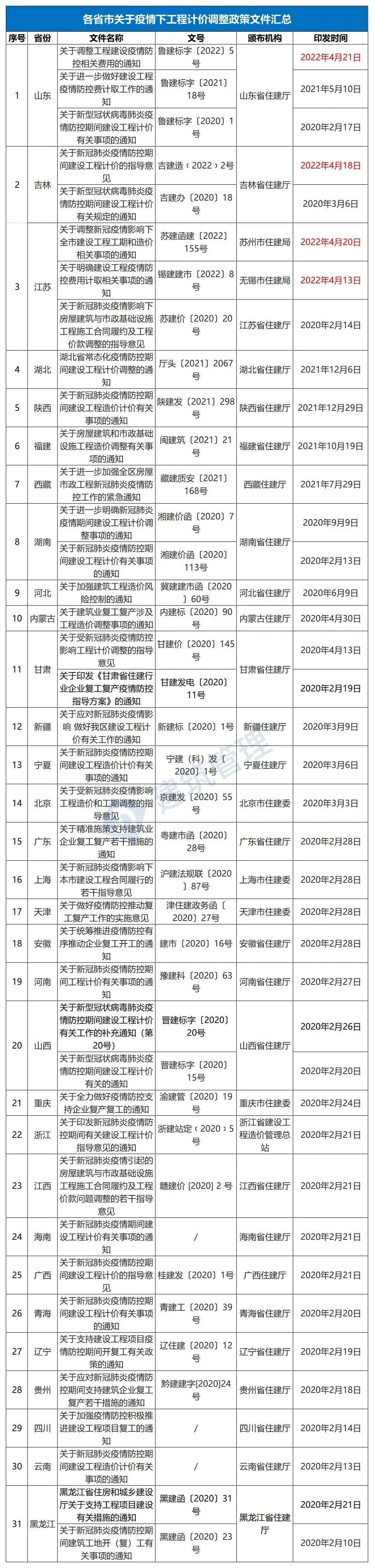 截至目前,各省市在疫情防控期間建設(shè)工程計價政策文件如下: