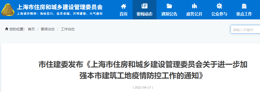 為全面貫徹落實市委、市政府疫情防控工作決策部署, 堅持“動態(tài)清零”總方針不動搖,把建筑工地疫情社會面清零落到實處,堅決遏制工地疫情反彈,市住房城鄉(xiāng)建設(shè)管理委發(fā)布了《上海市住房和城鄉(xiāng)建設(shè)管理委員會關(guān)于進(jìn)一步加強(qiáng)本市建筑工地疫情防控工作的通知》。