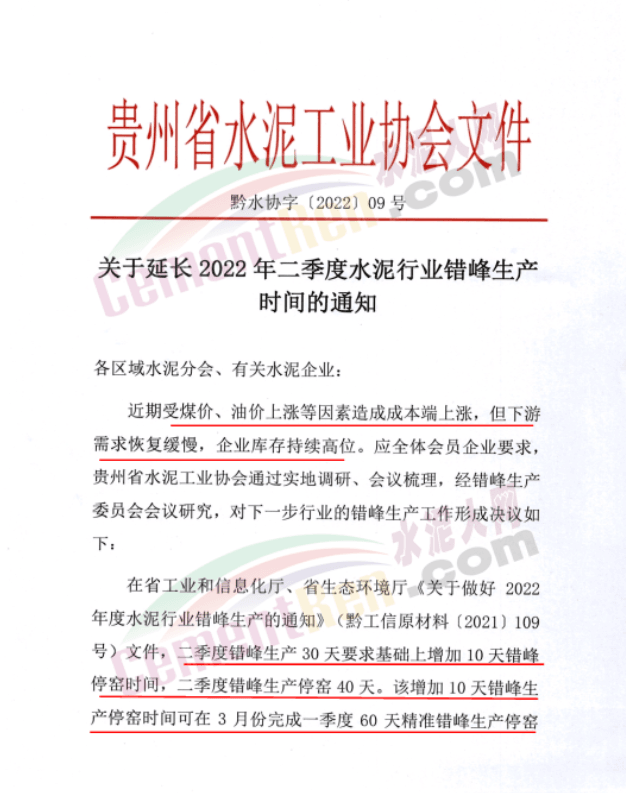 據水泥人網此前消息,3月16日,貴州省水泥工業協會發布了《關于延長2022年二季度水泥行業錯峰生產時間的通知》稱,受煤價、油價上漲等因素造成成本端上漲,但下游需求恢復緩慢,企業庫存持續高位。應企業要求延長2022年錯峰生產時間,其中二季度錯峰生產30天要求基礎上增加10天錯峰停窯時間,二季度錯峰生產停窯40天。