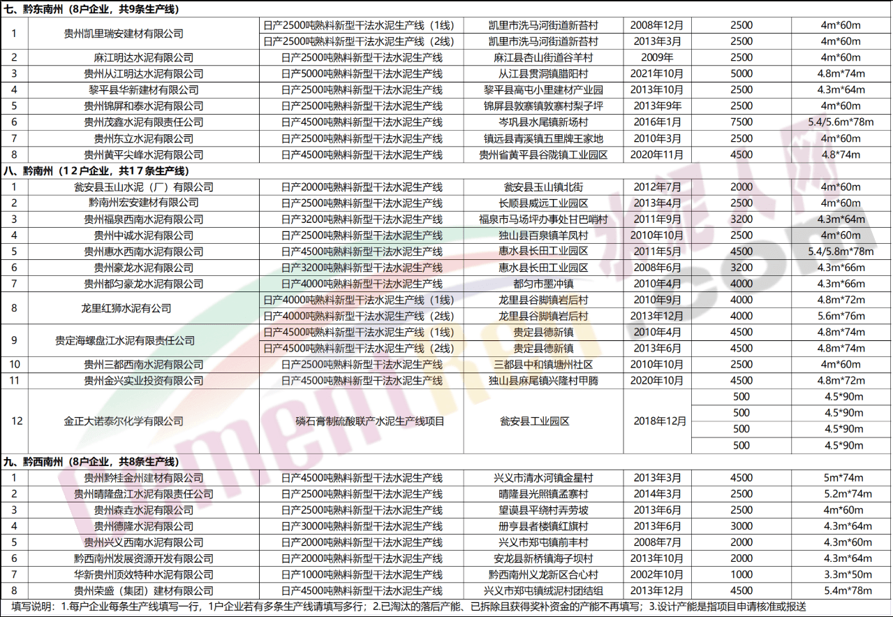從貴州省工信廳發布的《2021年度水泥熟料生產線清單》可見貴州省內共有水泥熟料生產線94條,合計產能8449.2萬噸。