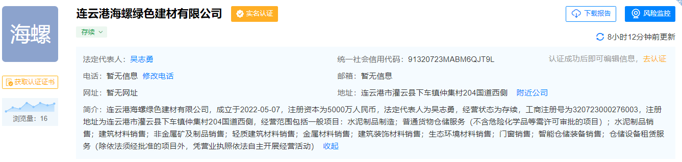 天眼查數據顯示,海螺綠色建材成立于2022年5月7日,法定代表人為吳志勇,注冊資本為5000萬元人民幣。該公司經營范圍包括水泥制品制造、普通貨物倉儲服務(不含危險化學品等需許可審批的項目)等。海螺水泥持該公司股份100%。