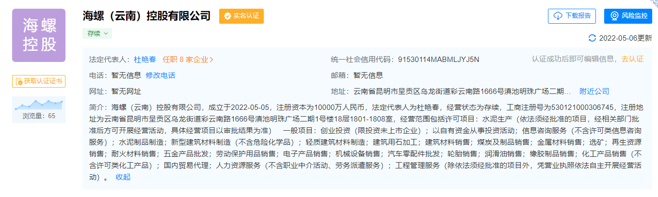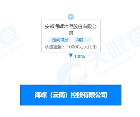 天眼查數據顯示,海螺(云南)控股有限公司成立于2022年5月5日,注冊資本1億元,法人代表為杜艷春,經營范圍包括:水泥生產;創業投資(限投資未上市企業);以自有資金從事投資活動;信息咨詢服務(不含許可類信息咨詢服務)等。目前,其由海螺水泥100%持股。