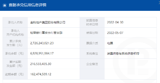 金科地產集團股份有限公司依然在逾期名單之中,查詢金科地產4月末商票累計逾期金額達2.17億元,月末逾期余額為1.62億元,金額較3月有所擴大。
