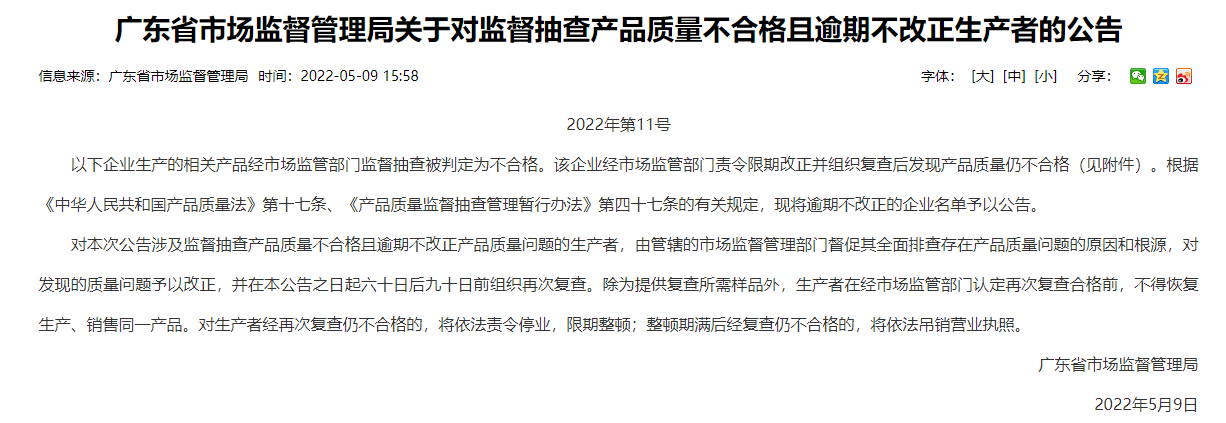 公告稱,對本次公告涉及監督抽查產品質量不合格且逾期不改正產品質量問題的生產者,由管轄的市場監督管理部門督促其全面排查存在產品質量問題的原因和根源,對發現的質量問題予以改正,并在本公告之日起六十日后九十日前組織再次復查。除為提供復查所需樣品外,生產者在經市場監管部門認定再次復查合格前,不得恢復生產、銷售同一產品。對生產者經再次復查仍不合格的,將依法責令停業,限期整頓;整頓期滿后經復查仍不合格的,將依法吊銷營業執照。