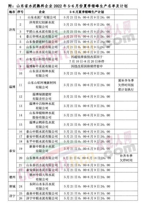 實施時間為2022年5月21日0:00-6月9日24:00,時間20天。實施對象為山東省水泥熟料企業的熟料生產線(含特種熟料生產線和建通窯、不含山東魯北化工股份有限公司和山東匯泰再生資源有限公司的化工配套熟料生產線)。