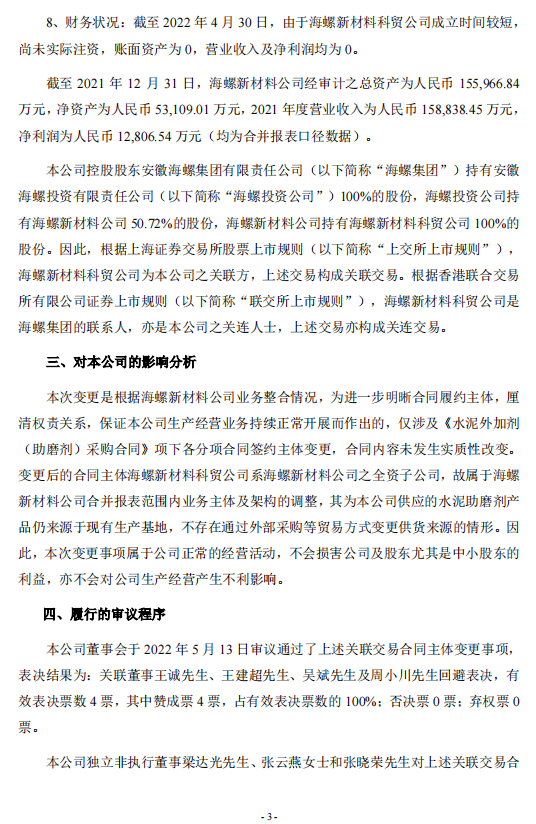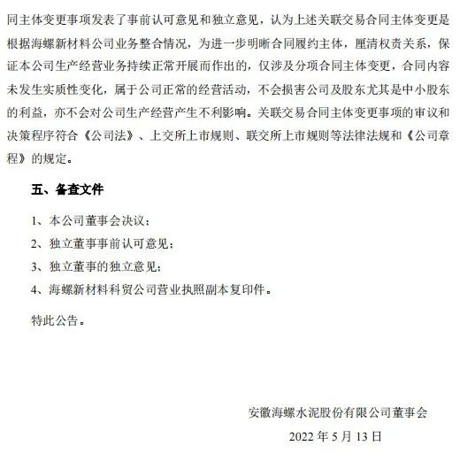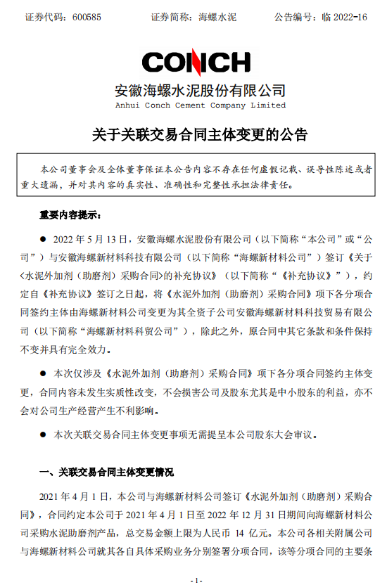 日前,海螺水泥發布《關于關聯交易合同主體變更的公告》稱,2022年5月13日,安徽海螺水泥股份有限公司與安徽海螺新材料科技有限公司簽訂《關于<水泥外加劑(助磨劑)采購合同>的補充協議》,約定自《補充協議》簽訂之日起,將《水泥外加劑(助磨劑)采購合同》項下各分項合同簽約主體由海螺新材料公司變更為其全資子公司安徽海螺新材料科技貿易有限公司,除此之外,原合同中其它條款和條件保持不變并具有完全效力。
