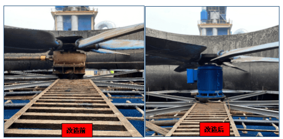 冷卻塔驅動改造前后對比數據可見,設備改前電機功率為55KW,運行功率為52KW。應客戶要求改造后需提升冷卻風量,電機需從原136轉/分鐘提升轉速至150轉/分鐘。