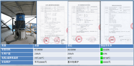 該風掃煤球磨機設備改前電機功率為900KW,運行功率均值為660KW,轉速為118轉/分,改后直驅電機額定功率不變,轉速為120轉/分,運行功率均值為560KW,每小時節電100KWh,有功節電率為15.15%。