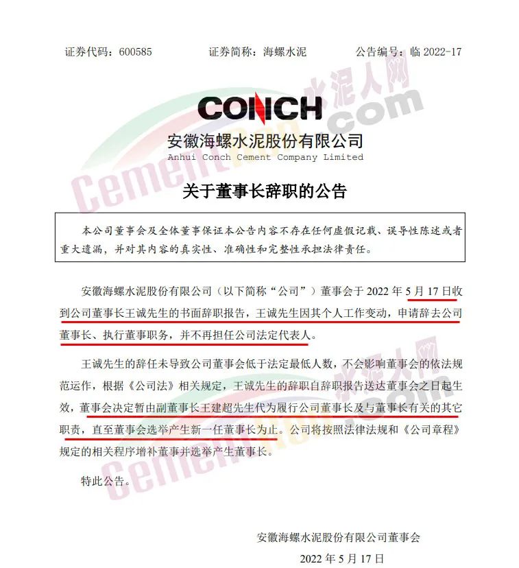 安徽海螺水泥股份有限公司董事會5月17日發布《關于董事長辭職的公告》稱,安徽海螺水泥股份有限公司(以下簡稱“公司”)董事會于2022年5月17日收到公司董事長王誠先生的書面辭職報告,王誠先生因其個人工作變動,申請辭去公司董事長、執行董事職務,并不再擔任公司法定代表人。