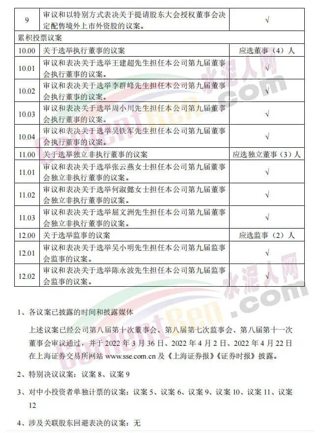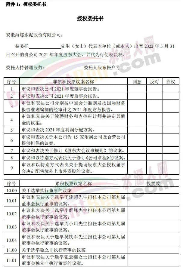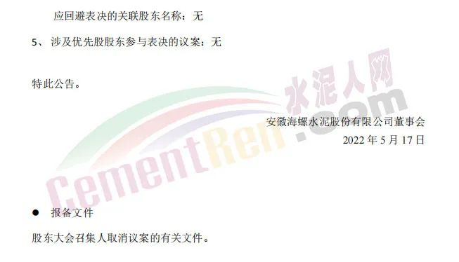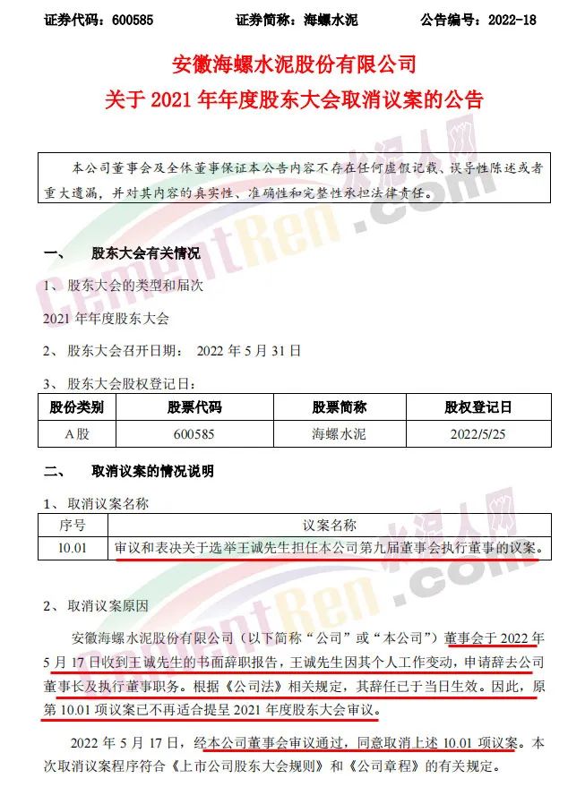 同日發布《關于2021年年度股東大會取消議案的公告》稱,安徽海螺水泥股份有限公司董事會于2022年5月17日收到王誠先生的書面辭職報告,王誠先生因其個人工作變動,申請辭去公司董事長及執行董事職務。根據《公司法》相關規定,其辭任已于當日生效。因此,原第10.01項議案“審議和表決關于選舉王誠先生擔任本公司第九屆董事會執行董事的議案。”已不再適合提呈2021年度股東大會審議。