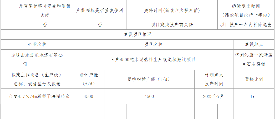 據(jù)了解,2021年3月內(nèi)蒙古工信廳發(fā)布關(guān)于赤峰山水遠(yuǎn)航水泥有限公司日產(chǎn)4500噸水泥熟料生產(chǎn)線退城搬遷項(xiàng)目產(chǎn)能置換方案的公示,內(nèi)容顯示,赤峰山水遠(yuǎn)航水泥有限公司擬整合現(xiàn)有1條日產(chǎn)2500噸干法窯水泥生產(chǎn)線、1條日產(chǎn)2000噸干法窯水泥生產(chǎn)線,等量置換在喀喇沁旗十家滿族鄉(xiāng)石灰窯村建設(shè)1條日產(chǎn)4500噸水泥熟料生產(chǎn)線。項(xiàng)目計(jì)劃于2023年7月點(diǎn)火投產(chǎn)。