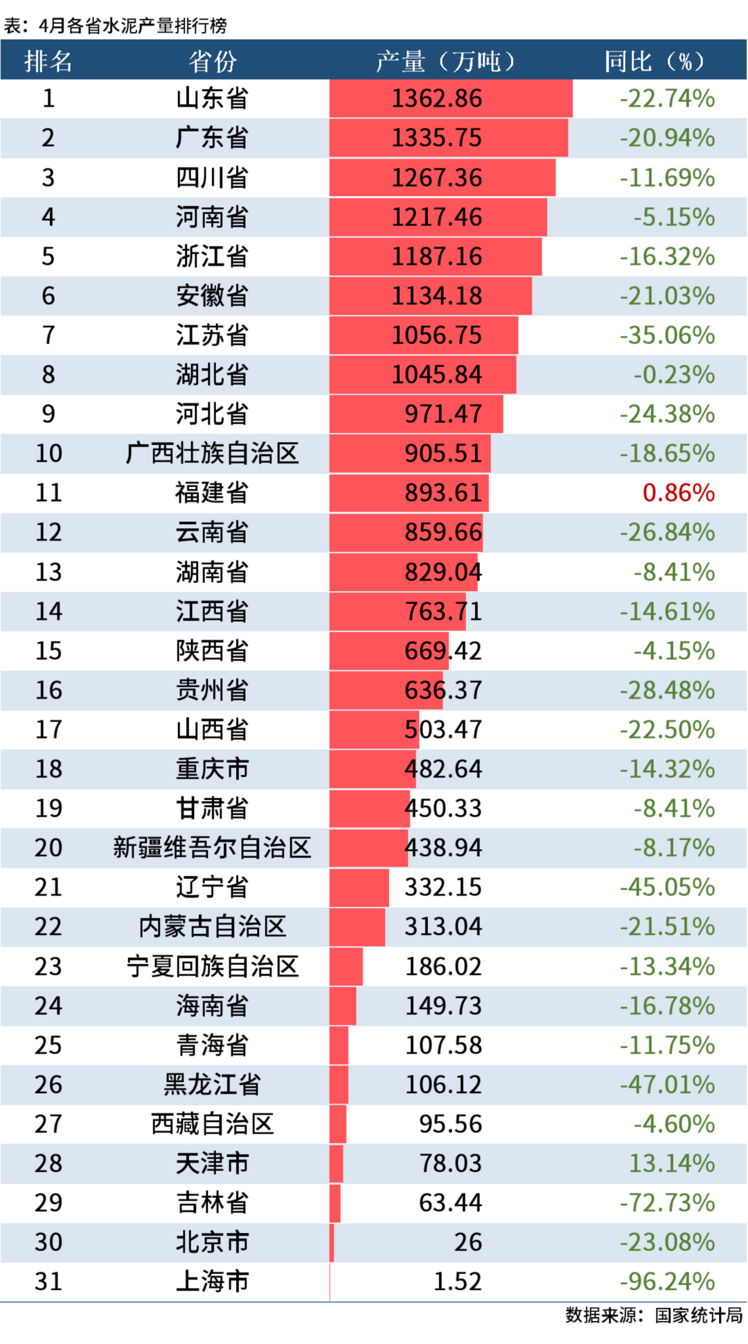 從分省數據來看,30省數市產量均有不同程度的下降,僅有福建省小幅增長0.86%。其中,4月全國14個省市水泥產量同比降幅超20%,上海降96.24%、吉林降72.73%,黑龍江降47.01%、遼寧降45.05%、江蘇降35.06%、貴州降28.48%,云南降26.84%、河北降24.38%、北京降23.08%、內蒙古降21.51%、山東降22.74%、安徽降低21.03%和廣東降20.94%。具體情況如下: