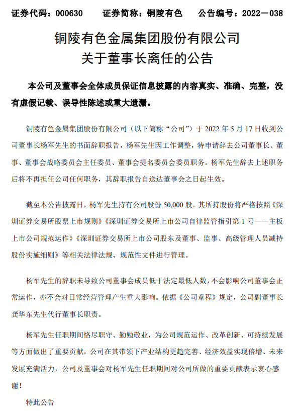2012年調(diào)任有色控股黨委副書記、董事、總經(jīng)理以及旗下上市公司銅陵有色的黨委書記。此后的10年里,楊軍一路升任至銅陵有色董事長。