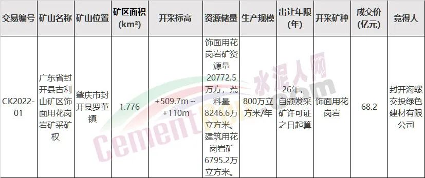 水泥人網注意到,肇慶市自然資源局4月11日,發布的《廣東省封開縣古利山礦區飾面用花崗巖礦采礦權第二次掛牌公告》顯示,此次競拍起始價為68.2億元,每次加價幅度為人民幣1000萬元或其整數倍,交易保證金為10億元,采用無底價網上掛牌公開出讓。