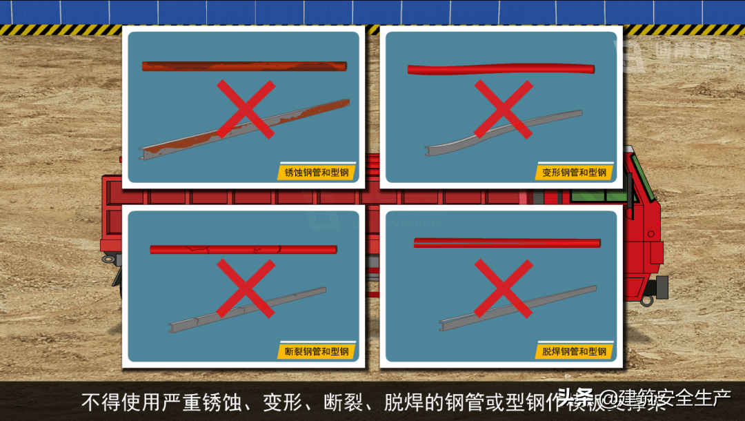 2.模板支撐架構配件進場應進行驗收,構配件及材質應符合專項施工方案及相關標準的規定。不得使用嚴重銹蝕、變形、斷裂、脫焊的鋼管或型鋼做模板支撐架。嚴禁使用竹、木材和剛才混搭的結構。所采用的構件應進行復試。