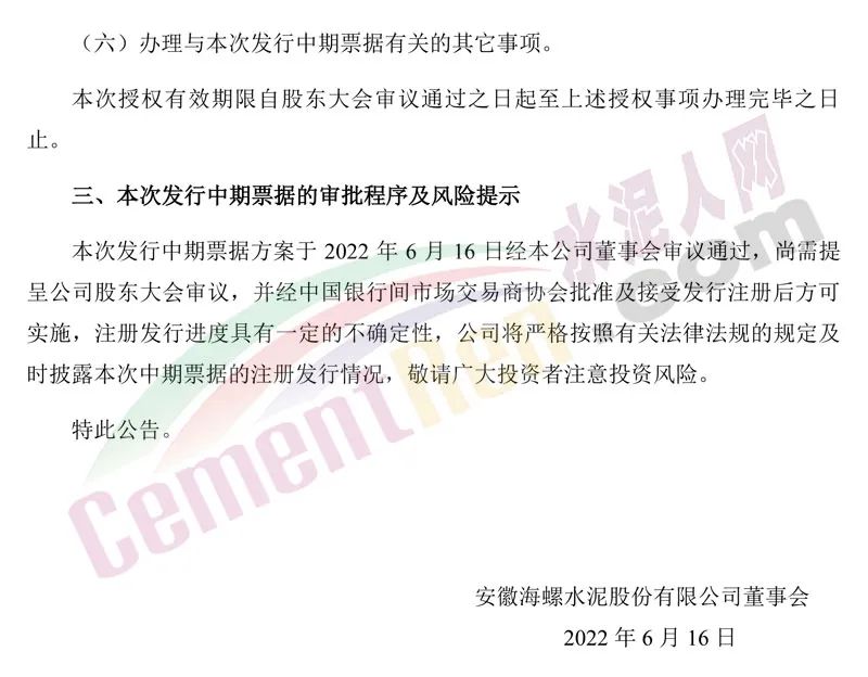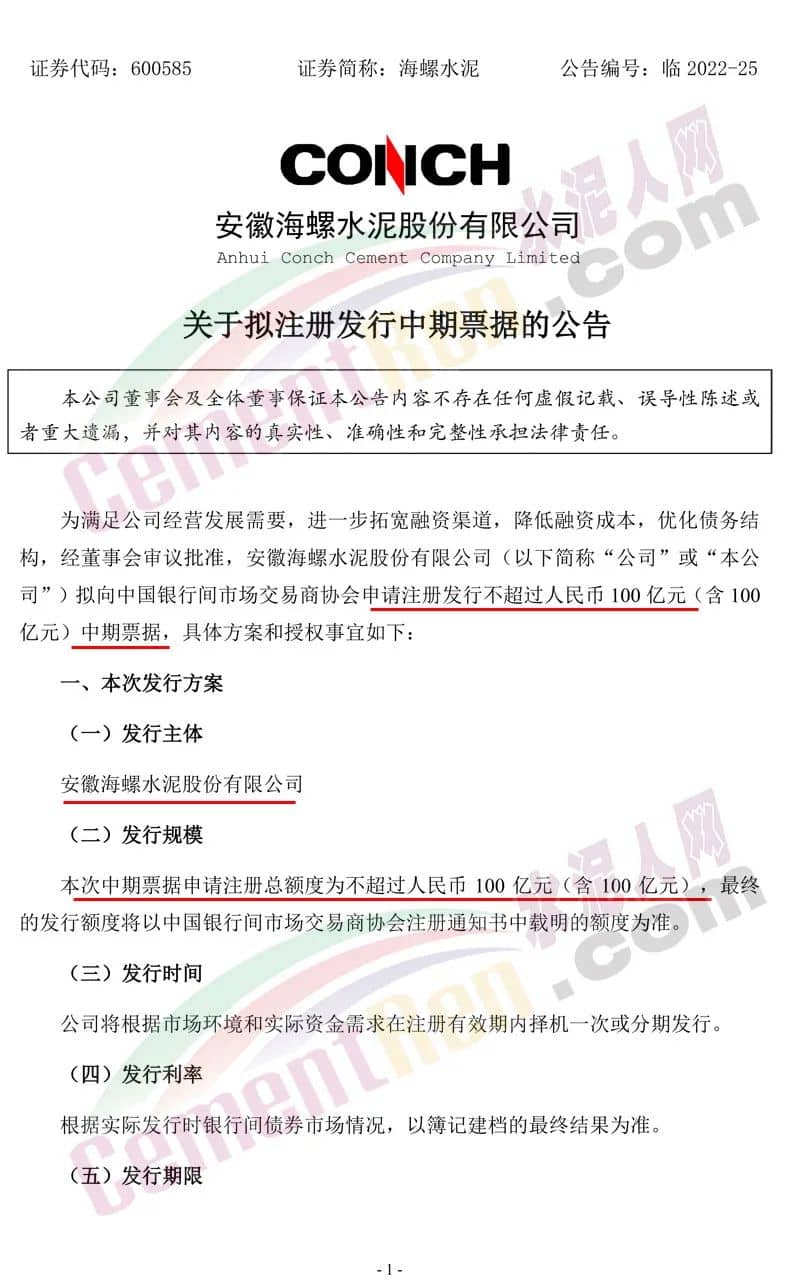 6月16日晚間,海螺水泥發(fā)布《關(guān)于擬注冊發(fā)行中期票據(jù)的公告》稱,為滿足公司經(jīng)營發(fā)展需要,進(jìn)一步拓寬融資渠道,降低融資成本,優(yōu)化債務(wù)結(jié)構(gòu),經(jīng)董事會審議批準(zhǔn),安徽海螺水泥股份有限公司(以下簡稱“公司”或“本公司”)擬向中國銀行間市場交易商協(xié)會申請注冊發(fā)行不超過人民幣100億元(含100億元)中期票據(jù)。