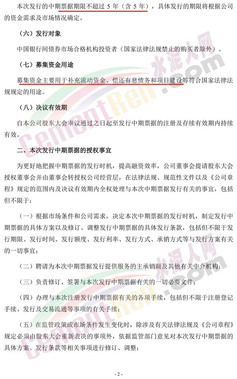 發(fā)行對象為,中國銀行間債券市場合格機(jī)構(gòu)投資者(國家法律法規(guī)禁止的購買者除外)。募集資金主要用于補(bǔ)充流動資金、償還有息債務(wù)和項(xiàng)目建設(shè)等符合國家法律法規(guī)規(guī)定的用途。自本公司股東大會審議通過之日起至發(fā)行中期票據(jù)的注冊及存續(xù)有效期內(nèi)持續(xù)有效。