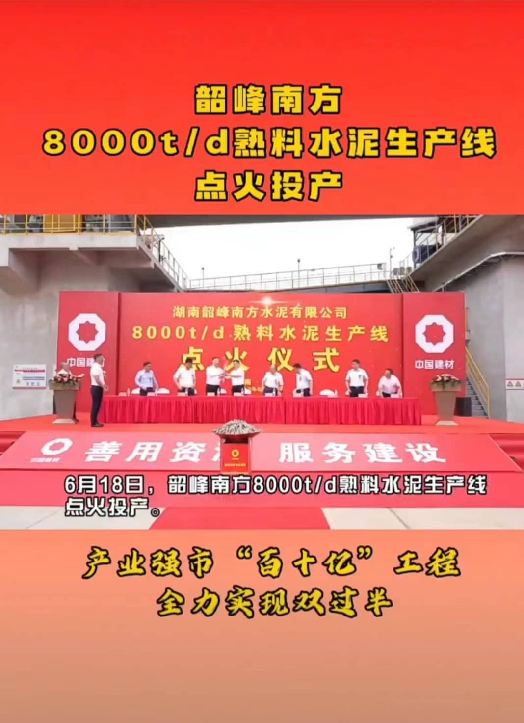 6月18日,韶峰南方8000t/d熟料水泥生產線點火投產。中南水泥黨委書記、董事長、總裁呂文斌,湘潭市人大常委會副主任、湘鄉市委書記趙新文,市委副書記、市長郭勇出席點火儀式。