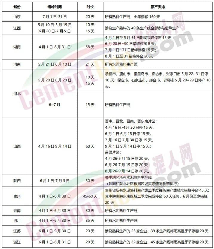 此前,貴州、陜西等地已發布二季度水泥停窯計劃安排,不少地區停窯時間超過1個月。