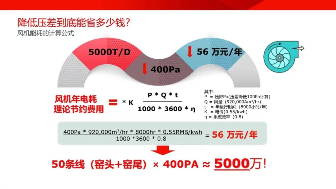 以戈爾濾袋5年使用壽命算算,一條日產5000的熟料生產線計算:一年運行8000小時,風量920000立方小時,壓降400pa,風機效率80%,電價0.55元度,年降低費用56萬。一家集團企業50條窯線(窯頭、窯尾),可節約5000萬/年。