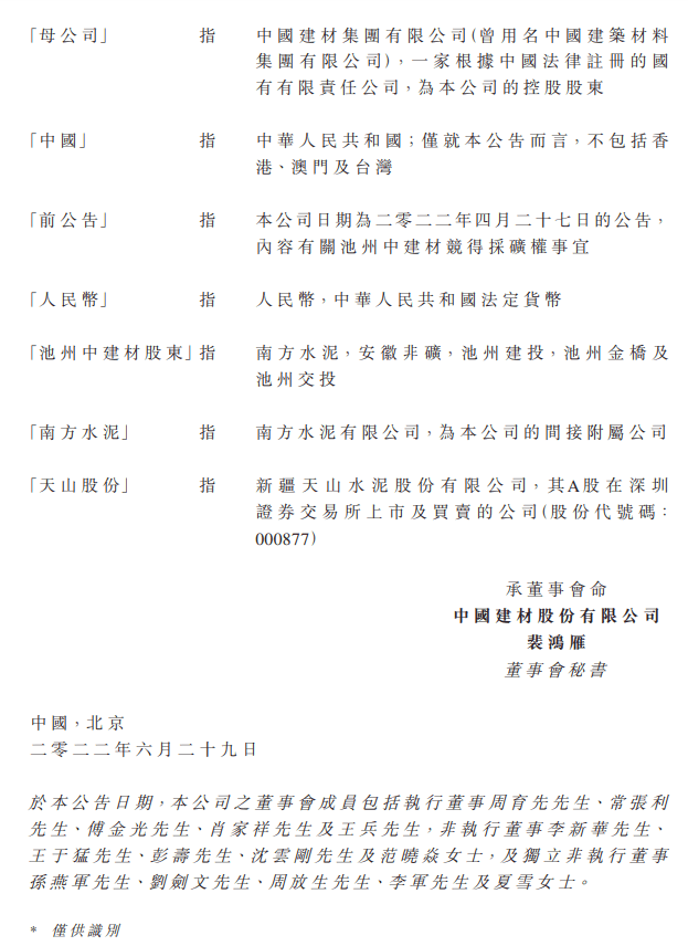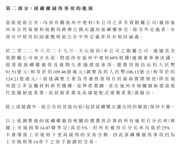 同日,天山股份(該公司的附屬公司,間接持有池州中建材60%股權)通過董事會決議,批準就采礦權競得及后期生產線建設事項,總費用預估由約人民幣91.51億元(相等于約109.46億港元)調整為約人民幣106.13億元(相等于約124.21億港元)。